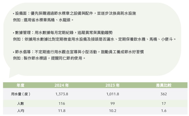 隆中台中營運據點所使用之水源,來自台灣自來水公司,並未取用地下水或其他方式供水,日常用水用途主要為員工飲用、清潔、澆灌及空調設備運作,屬一般性生活用水,對周邊水資源無顯著影響或汙染。然因2024 年公司人數較2023 年增加且空調水塔浮球開關故障漏水,致2024 年總用水量較2023 年增加362 度,增加幅度為35.8%;2024 年人均用水量11.8 度,較2023 年增加1.6 度,因應台灣氣候變遷導致的水資源挑戰,我們積極從日常管理、設備建置到行為倡導多面向進行控管與優化,以減少水資源的耗用。