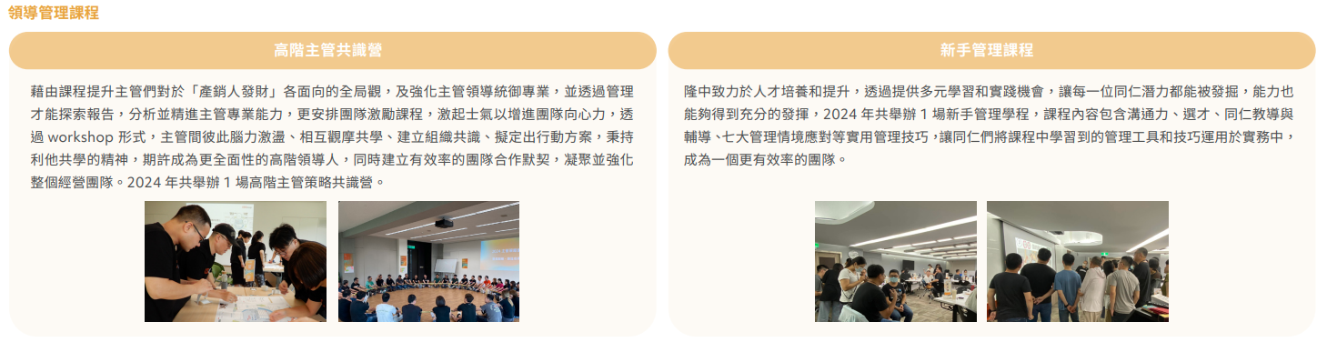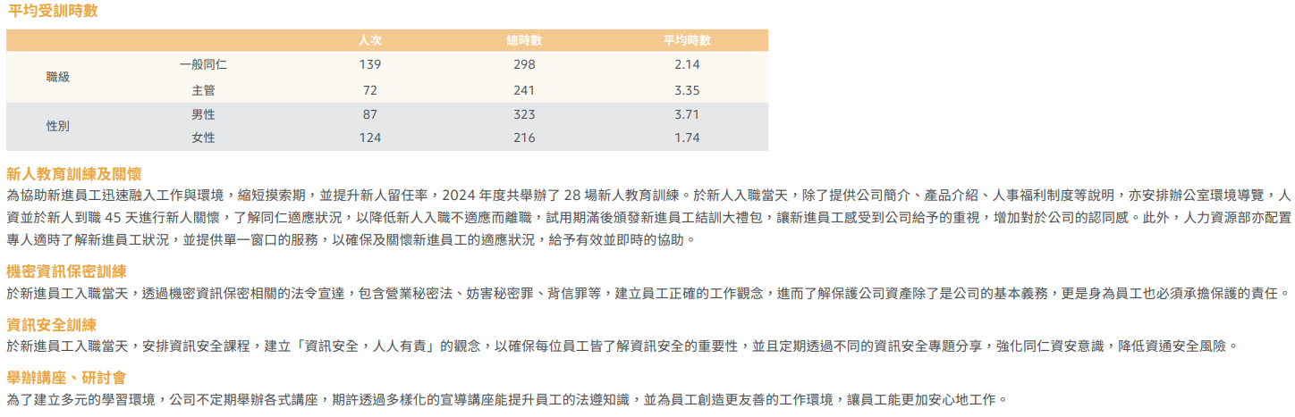 - 培育發展 (Talent Development):導入科學化職能體系,規劃新手管理學程、主管共識營等系統性課程;提供全額外部訓練費用補助。