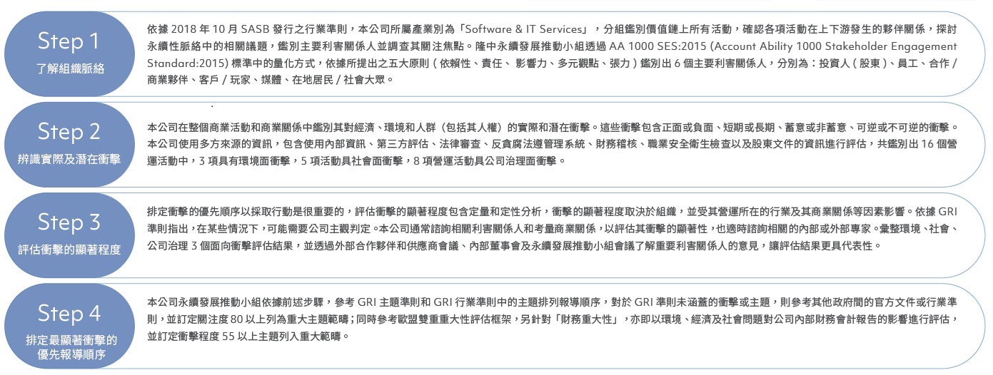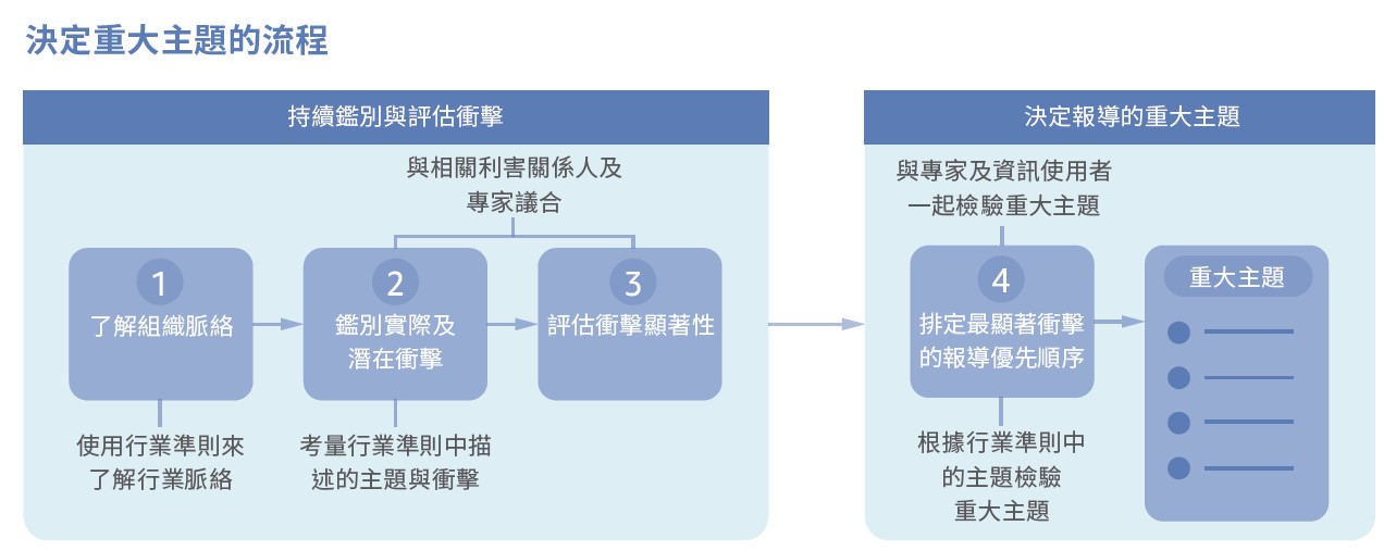 隆中依循GRI Standard,GRI 3:重大主題 2021 的方法學執行重大性分析,設計出永續重大議題鑑別與分析方法,與利害關係人進行開放性討論、問卷蒐集或訪談,並參考同業及國內外標竿企業案例,了解利害關係人對不同永續議題的重視程度;考量產業特性,本公司也依循SASB之準則及GRI之要求鑑別重大主題,致力透過量身定做的方法學理解永續議題對於隆中的衝擊與影響,制定多元的因應措施並積極與利害關係人溝通,持續發展正向影響及有效控制負向影響。