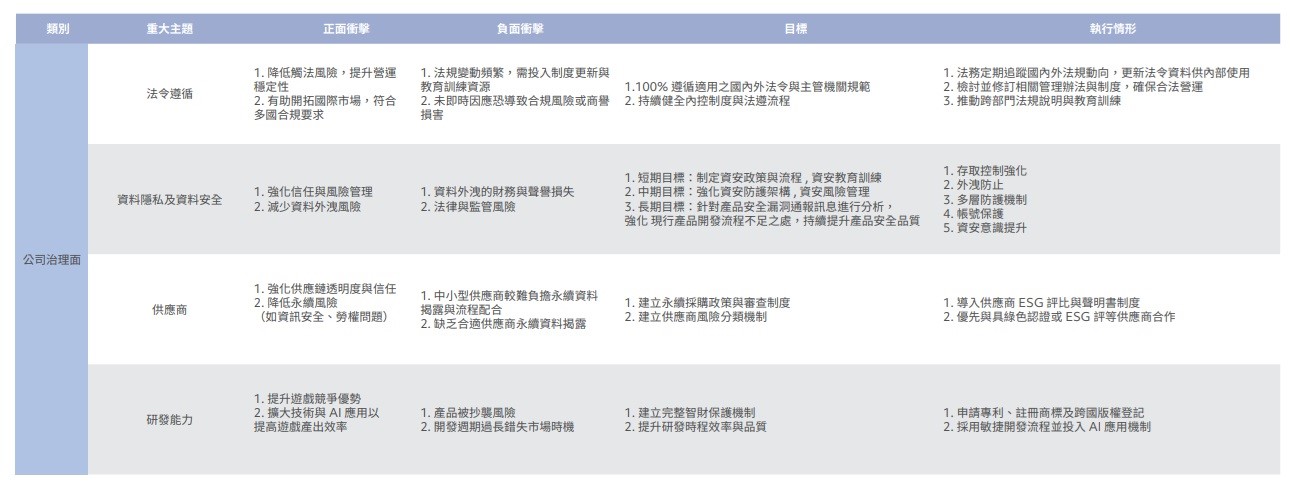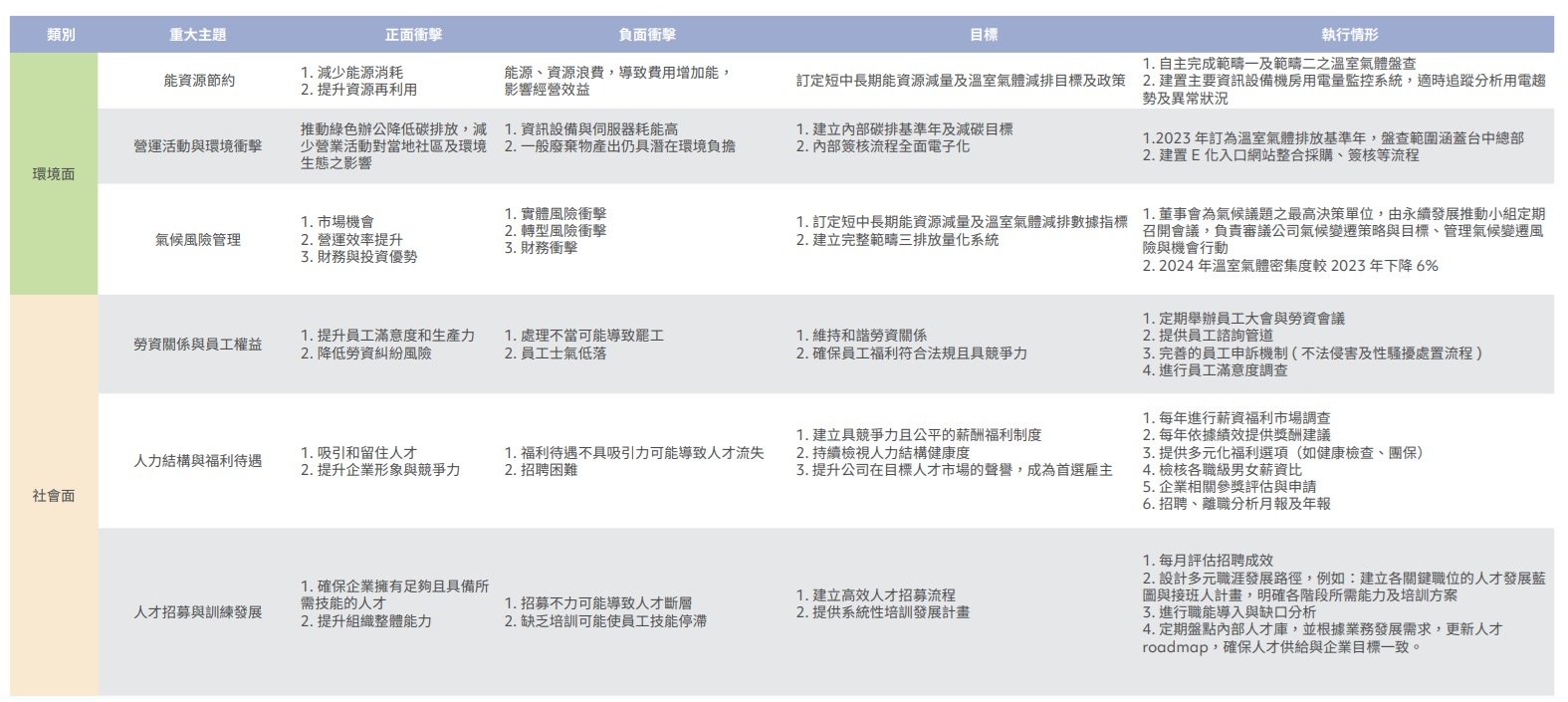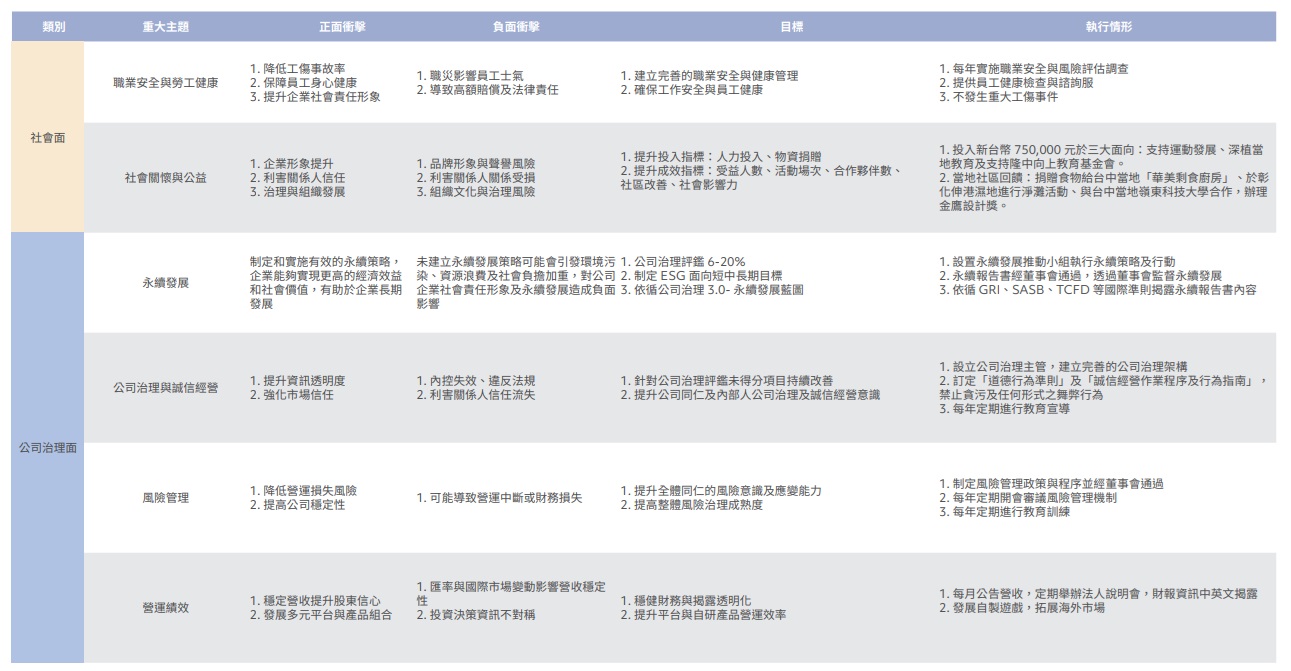 本公司考量雙重重大性,從對於企業發展、績效、定位與公司價值的影響程度,以及公司活動對環境、社會和公司治理面所造成的影響程度進行正面與負面之衝擊評估。共鑑別出16 個營運活動中,3 項具有環境面衝擊,5 項活動具社會面衝擊,8 項營運活動具公司治理面衝擊,並根據下列16 個營運活動分別詳述其正負面衝擊、目標以及執行情形。